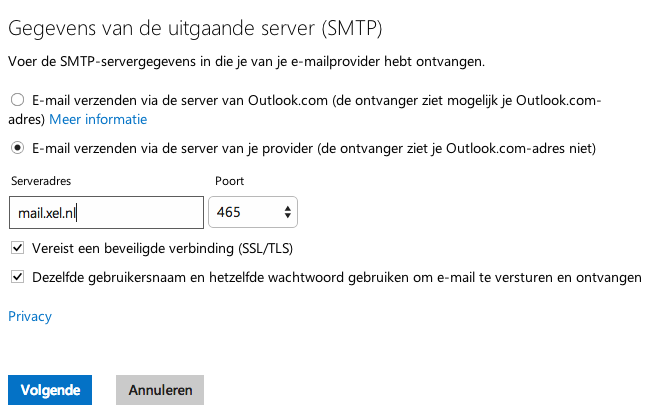 - Vul bij ‘Serveradres’ ‘mail.xel.nl’ in.
