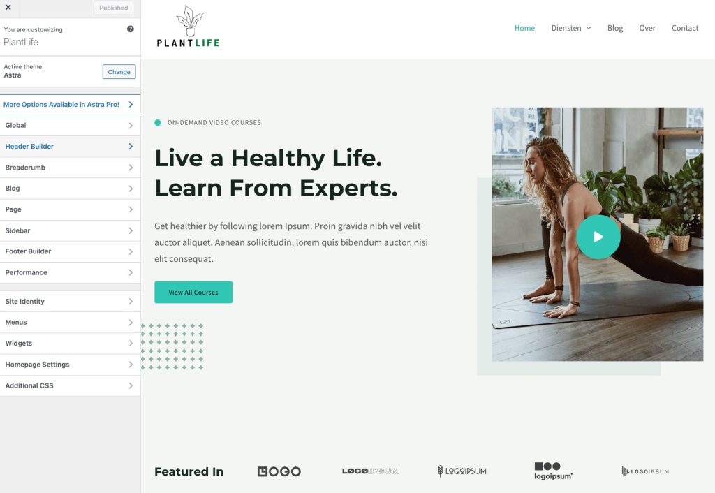 Maar veel thema’s houden hier wel rekening mee. Bij bijna alle betaalde en de beste gratis thema’s kun je kiezen uit een honderdtal templates voor de homepage. Die templates kun je dan importeren en met de pagebuilder bewerken.