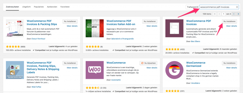 4. Zoek de plugin WooCommerce PDF Invoices  en klik op Nu installeren.