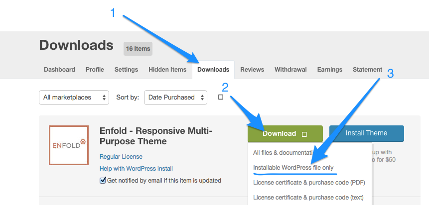 Een veelvoorkomend probleem is dan men ‘All files & Documentation’ download. Dan ontvang je een zip-bestand die je niet direct kan uploaden (dan moet je eerst het zip-bestandje openen) om zo enfold.zip te vinden (die hebben we straks nodig).