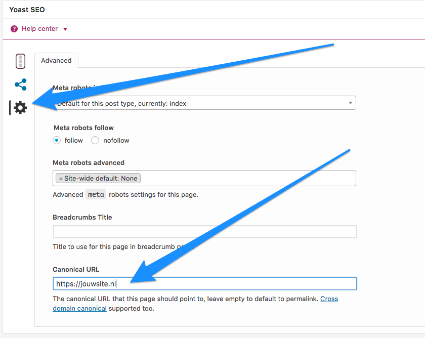 - En vul onderaan bij ‘Canonical URL’ de URL van de hoofdpagina is.