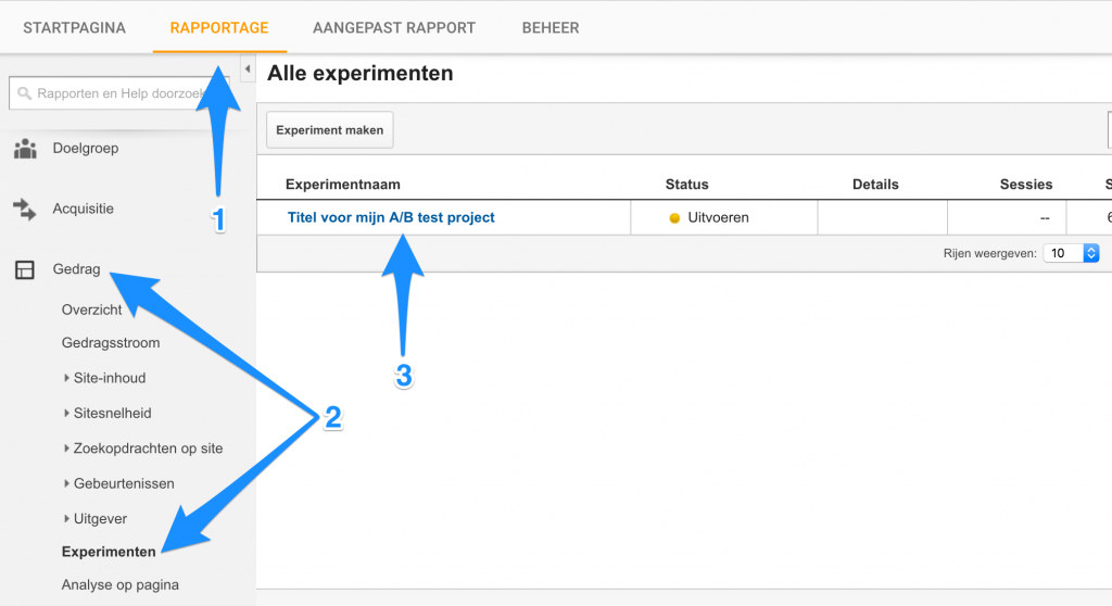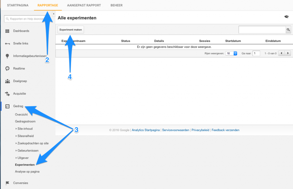 De voorbereidingen zijn gedaan. Nu ga ik je uitleggen hoe je in Google Analytics een experiment kunt aanmaken.