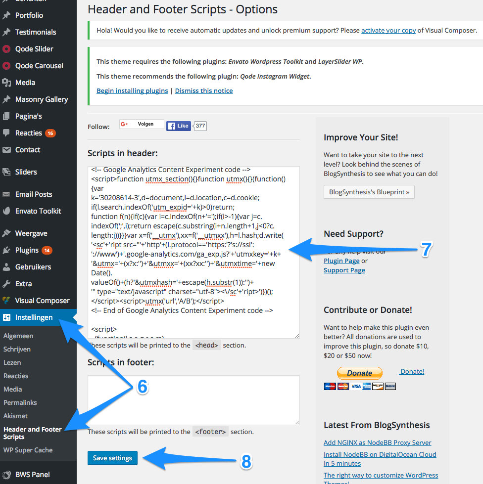 Kies je ervoor om de experimentcode zelf toe te voegen dan kan je dit doen met behulp van de plugin ‘Header and Footer Scripts.’ De plugin biedt de mogelijkheid om de benodigde code te kunnen invoegen zonder dat je in de daadwerkelijke broncode hoeft te werken.