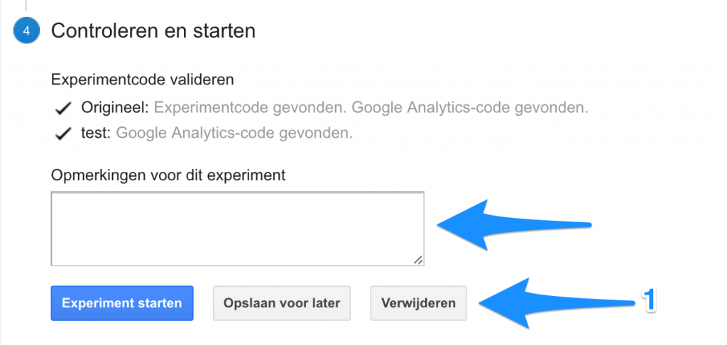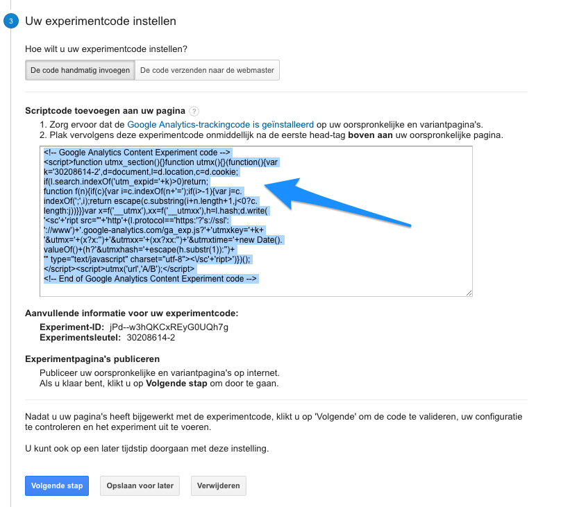 Belangrijk! Kopieer de experimentcode, deze heb je later nodig in je WordPress Dashboard.