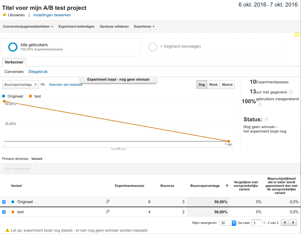 Het kan even duren voordat Google de test resultaten weergeeft. Bezoekers die op jou website komen worden willekeurig doorverwezen naar een van de pagina’s. Gedurende het experiment zullen bezoekers dezelfde pagina blijven zien als ze de website opnieuw bezoeken. Afhankelijk van je doelen zal Google aangeven welke pagina het beste werkt. Dit kan een aantal weken duren.