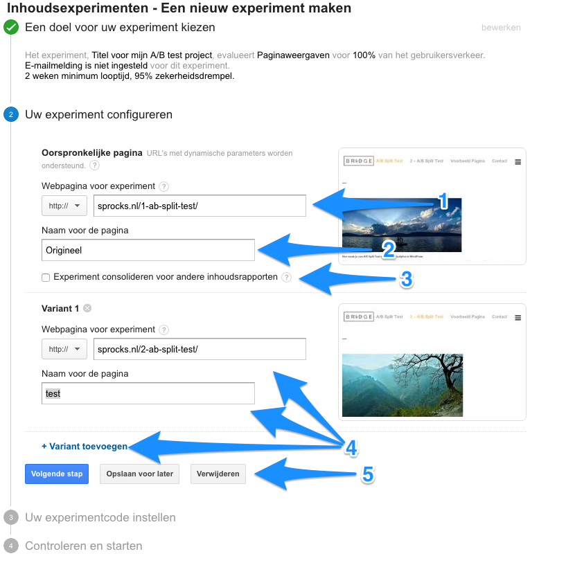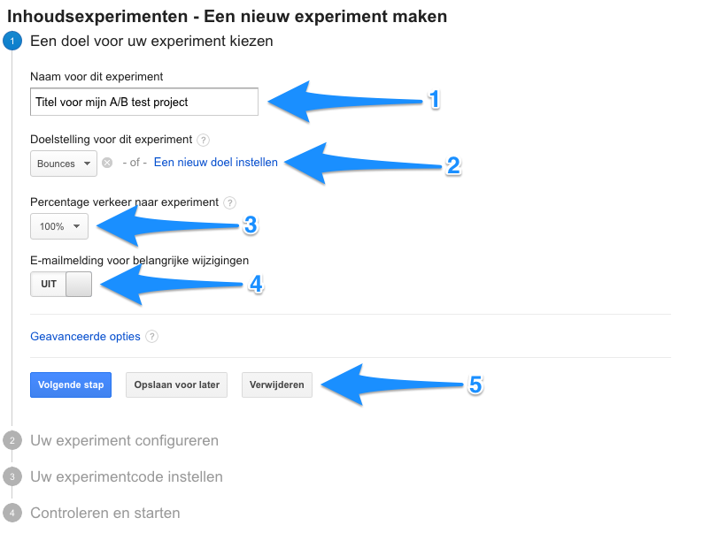 Ga vervolgens terug naar jouw Google Analytics experiment en klik op Volgende stap. Ook hier geldt dat je op Opslaan voor later kan klikken als je later wenst verder te gaan.