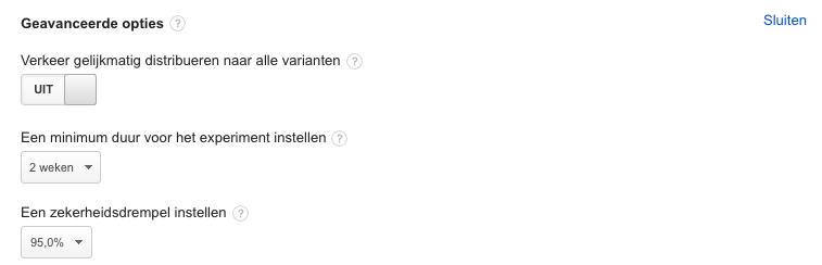 - Experiment consolideren voor andere gedragsrapporten. Met deze optie kun je aangeven dat bezoekers die naar de variatie pagina’s worden geleid wel de originele URL blijven zien (dit is aan te raden).