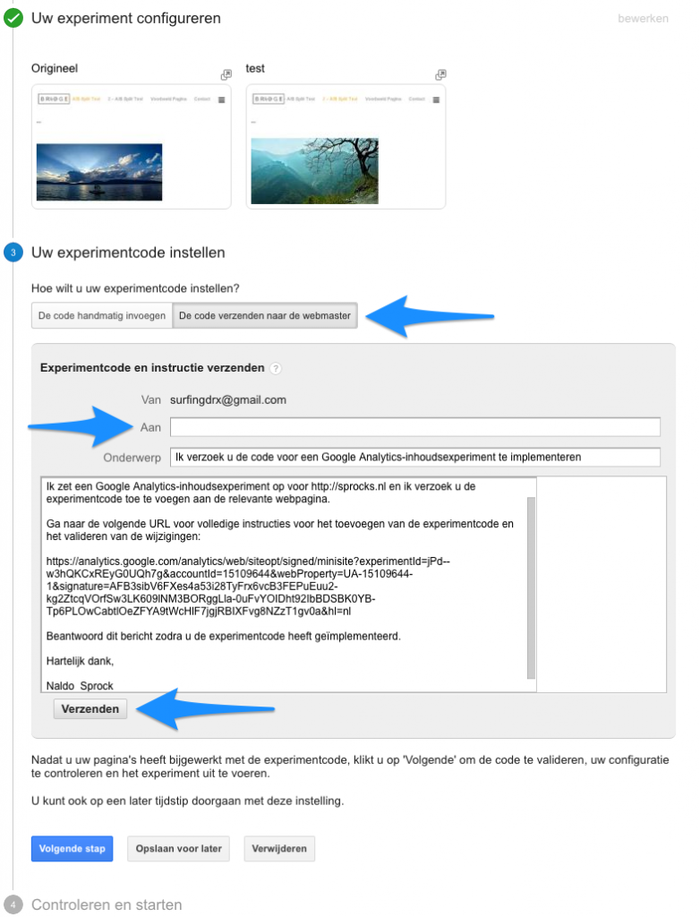 Bij het instellen van de experimentcode heb je twee opties. Je kan ervoor kiezen om de code zelf in de website te plaatsen of je kan ervoor kiezen om de code te e-mailen naar jouw webmaster.
