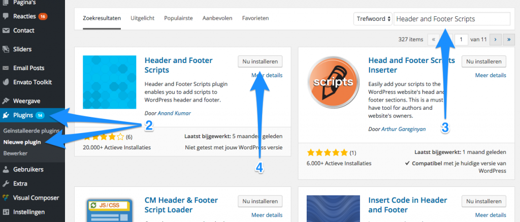 - Voer in het invoerveld de naam van de plugin ‘Header and Footer Scripts’ (Heb je de plugin al geïnstalleerd en geactiveerd, ga dan door naar stap 6).